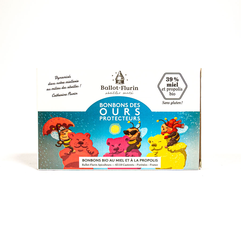 Blackberry flavor : Organic honey* 39%, wheat syrup*, cane sugar*, natural pectin, organic blackberry flavor* 1.1%, aqueous extract of white propolis* 1.0%, 'Bois de Ruche' Hive Elixir* (water, propolis*), black carrot concentrate*, acidifier: citric acid, coating agent: organic sunflower oil* and beeswax from organic beekeeping..
