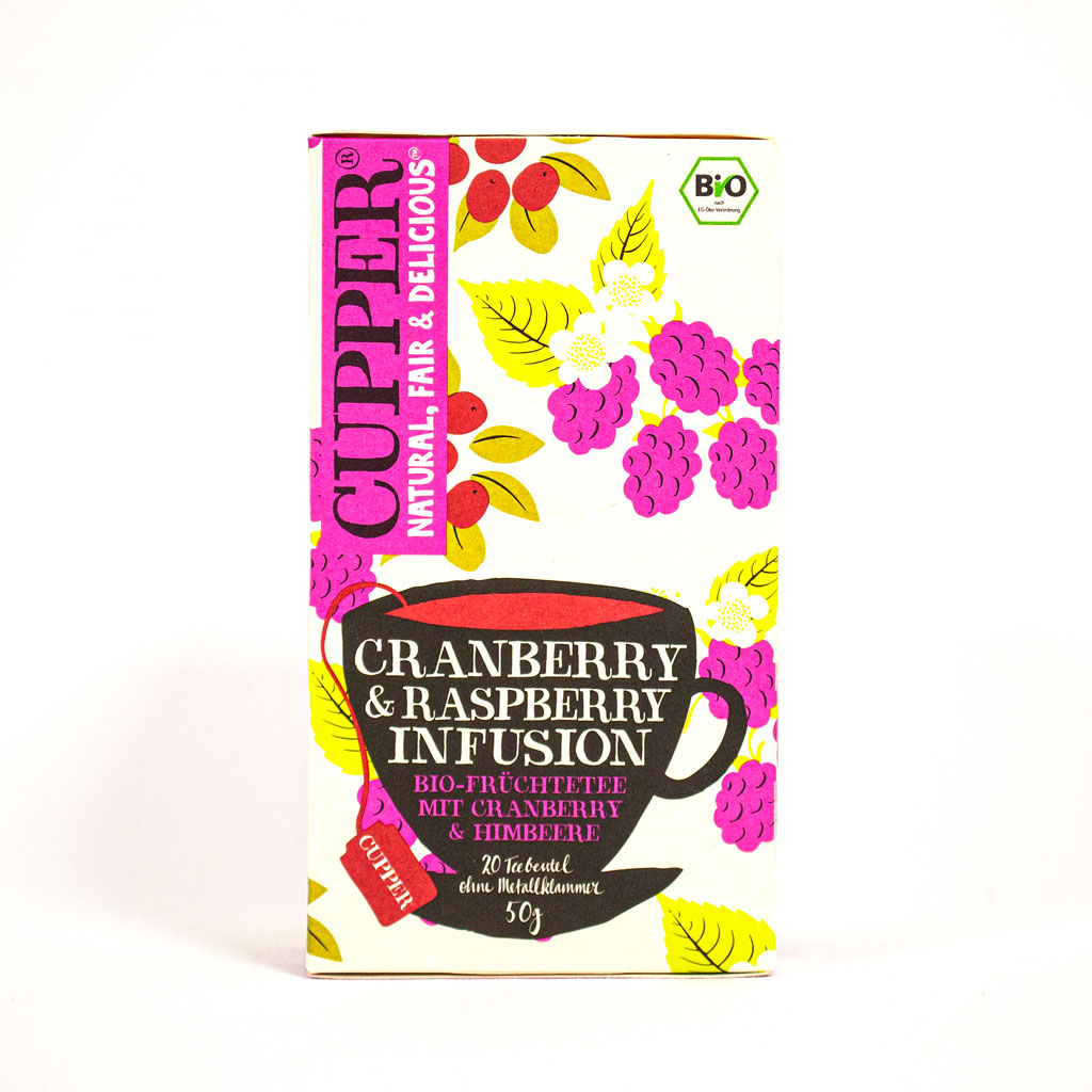 Съставки: хибискус*, шипка*, коприва*, корен женско биле*, естествени ароматизанти 3.5%, парченца ябълка*, естествен ароматизант малина с други естествени ароматизанти 1.5%, парченца червена боровинка* 1%, парченца малина* 1%. *от контролирано био производство.