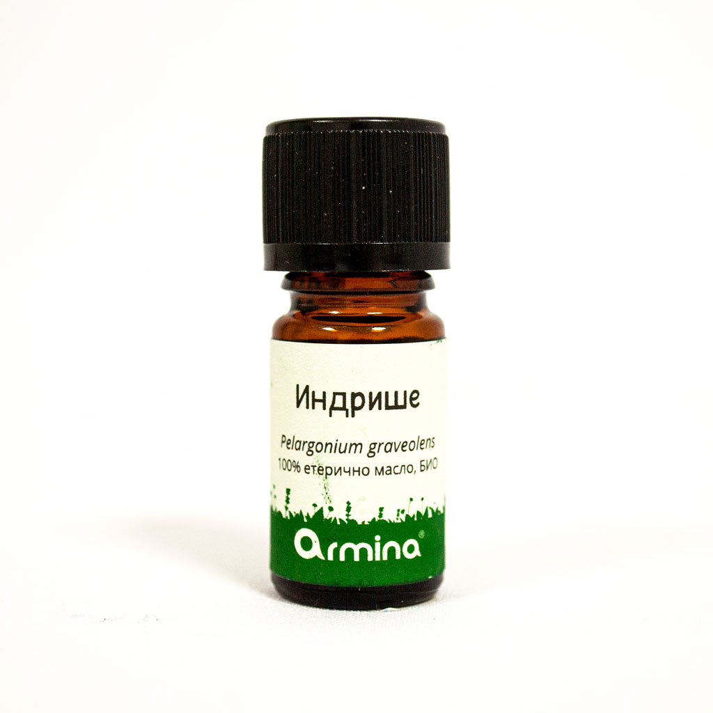 Pelargonium graveolens е едно от най-често срещаните и отглежданите при нас видове индрише. Растението има власинки, които му придават силен, приятен аромат на роза. Правите стъбла носят цветя с пет венчелистчета в съцветия, подобни на сенник. Етеричното масло от индрише се получава чрез парна дестилация на листата на Pelargonium graveolens. Има много разновидности и щамове на розовото цвете със свеж, флорален аромат. Всеки сорт се различава по аромат, но е почти идентичен по отношение на състава, ползите и употребата. Има антиоксидантни, антибактериални, противовъзпалителни, антимикробни и стягащи свойства. Смята се, че маслото от индрише с неговите антибактериални, антимикробни и антисептични свойства го правят полезно за намаляване на появата на акне, кожни раздразнения и инфекции, когато се прилага локално. Благоприятства цялостното състояние при оток и едема, помага в борбата с бактериални ифекции причинени от Staphylococcus aureus, Listeria monocytogenes. Може да има ползи за хора с невродегенеративни заболявания, които включват невровъзпаление, може да бъде от полза за жени, страдащи от намален естроген и симптоми, причинени от менопаузата и перименопаузата. Дифузирано може да намали тревожността, действа болкоуспокояващо при херпес, има благоприятен ефект при алергии, рани и диабет. Преди употреба препоръчваме да направите тест за алергия: Използвайте една капка от етеричното масло и я втрийте върху вътрешната страна на предмишницата. Изчакайте 15 минути. Ако има зачервяване, дразнене на кожата или някаква алергична реакция, незабавно прекратете употребата.