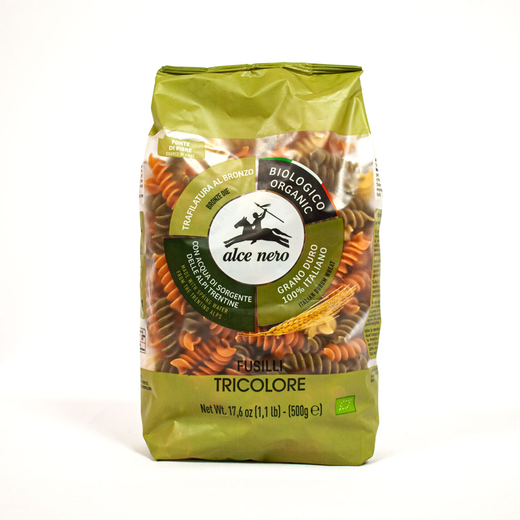Трицветните фузили на Alce Nero са произведени от органична твърда пшеница, отгледана в Италия. Отличният грис, получен от този сорт твърда пшеница след пресяване, се смесва с вода от Трентинските Алпи. Те са цветна комбинация от класически естествено жълти фузили, оранжеви – оцветени с помощта на сушени домати и зелени – придобили цвета си благодарение на спанак. Трицветните фузили са източник на фибри и са идеални за приготвяне на оригинални италиански ястия или сервирани с различни сосове.