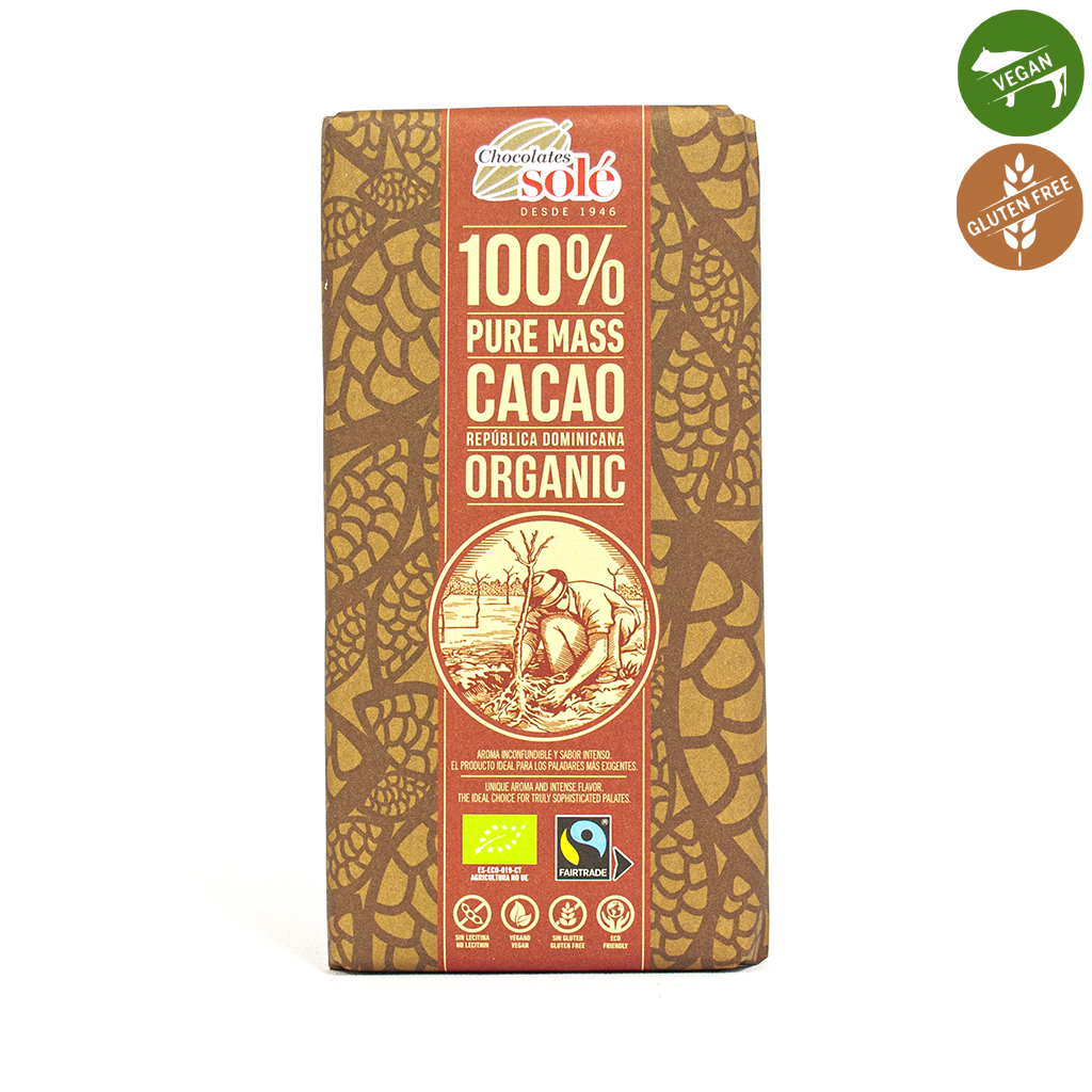 Черен шоколад, 100% съдържание на какао. Чиста какаова маса, без захар или подсладители. Силен вкус и неподправен аромат. Може да се използва и за кулинарни цели или да му се насладите чист.