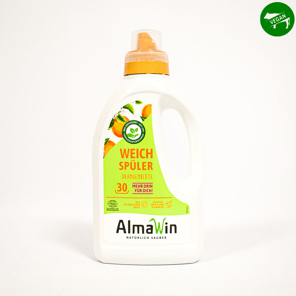 Омекотителят на AlmaWin с портокалов цвят, активни съставки на чисто растителна основа и натурални етерични масла от контролирано биологично земеделие глези с приятен цитрусов аромат. Омекотителят може да се комбинира с всички прахообразни и течни перилни препарати на AlmaWin и осигурява меко, добре поддържано пране и цялостно добро усещане за кожата.