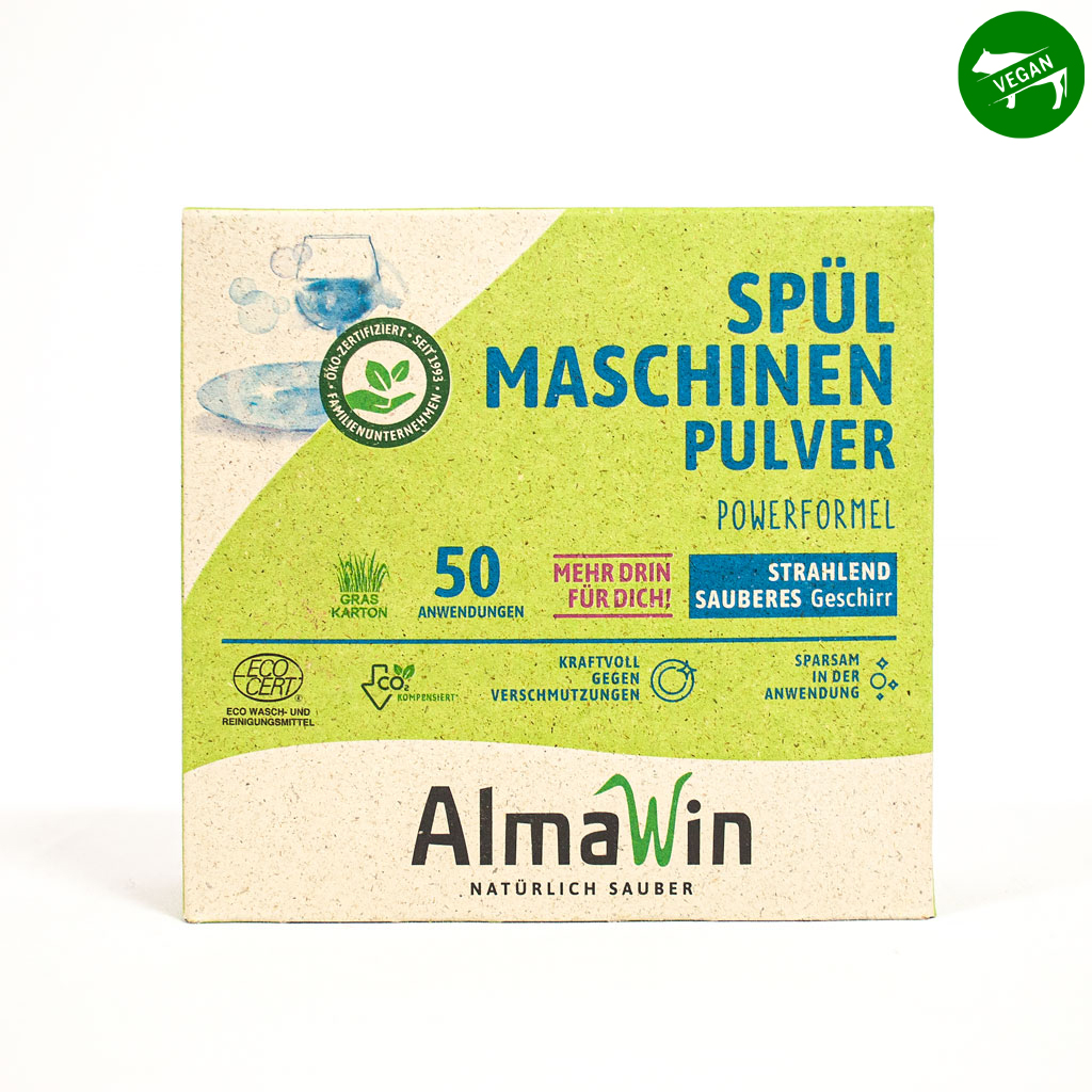 Мощната формула осигурява надеждно искрящо чисти съдове по екологичен начин, изцяло без фосфати, хлор и оптични избелители. Прахът за миялни машини е много ефективен дори при програми на ниски температури. Икономичен за използване, защото можете да го дозирате според нуждите си. Ефективно отстранява упорити остатъци от храна, мазнини, нишесте и протеини. Без синтетични аромати, оцветители и консерванти. Опаковката се състои от два компонента: вътрешната торбичка от фолио, която лесно може да се рециклира и картон от трева, който спестява ресурси и енергия, защото също може да бъде изхвърлен в пункта за събиране на хартия или дори компостиран.