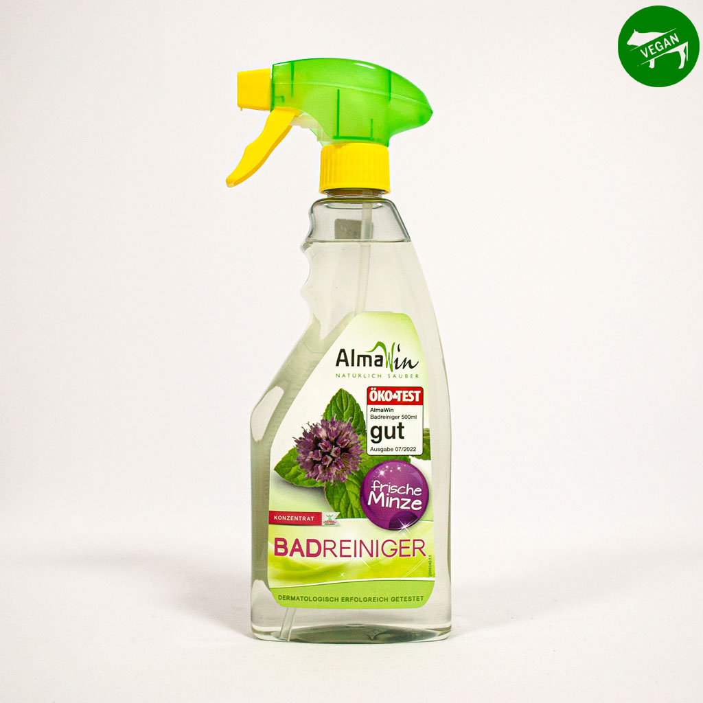Еко сертифициран почистващ препарат за баня AlmaWin с приятен естествен аромат на мента е мощен благодарение на формулата си от естествена лимонена и млечна киселина. Той ефективно разтваря варовик, остатъци от сапун и мръсотия и осигурява сияен блясък в цялата баня. Подходящ за всички киселинноустойчиви повърхности в банята. Препаратът е веган, био сертифициран от Ecogarantie и силно биоразградим концентрат. Внимателно подбраните естествени суровини са от растителен произход. Етеричното масло от мента идва от контролирано органично отглеждане. Продуктите на AlmaWin са успешно дерматологично тествани. Това гарантира добра съвместимост с кожата.