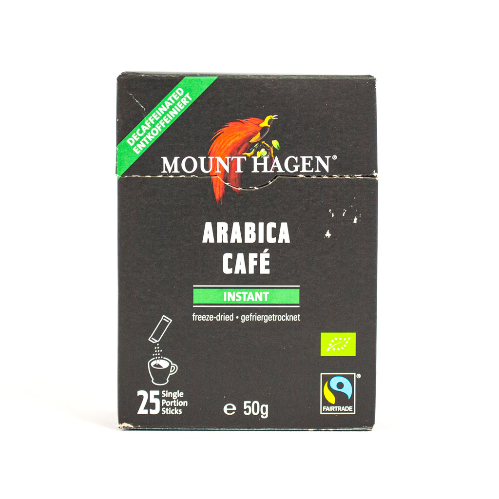 Mount Hagen постоянно оглавява списъците с най-добрите инстантни органични кафета. Плодова дълбочина от Папуа Нова Гвинея се съчетават с ядков вкус от Перу заедно с омайни подправки от Хондурас в тази изискана смес. Начина, по който кофеинът е премахнат от кафето е одобрен за биологично производство. По този начин се запазва дълбочината и аромата на кафето.