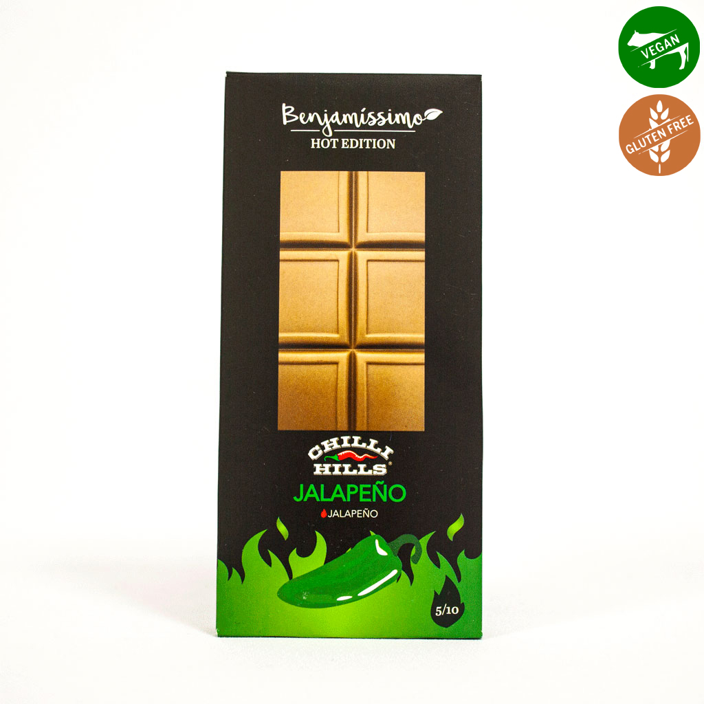БИО, веган шоколад, без глутен с люти чушки халапеньо. Запомняща се комбинация от сладко и лютиво. За изтънчен вкус. Сила на лютивост 5/10.