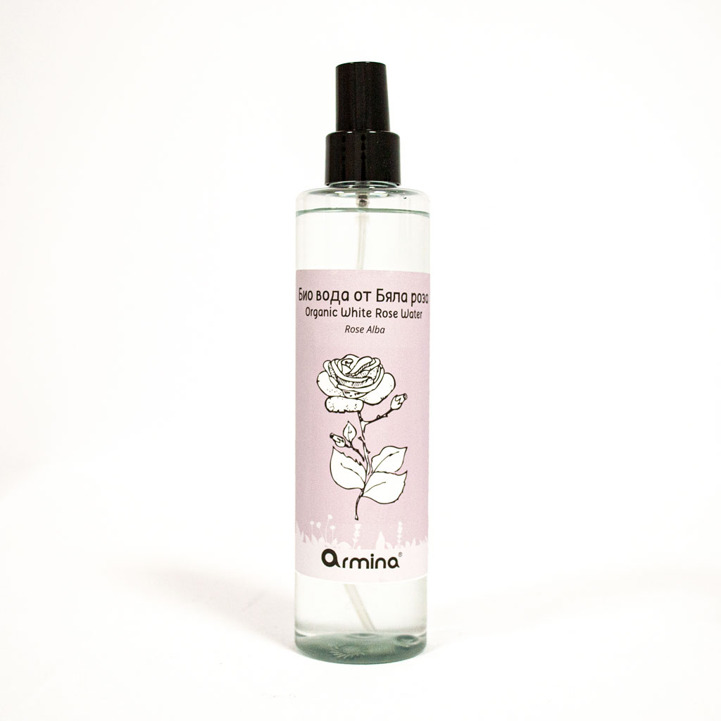 Био флоралната вода от бяла роза на Армина Био е подходяща за почистване, освежаване, успокояване и овлажняване на сухата и чувствителна кожа. Флоралната вода от бяла роза притежава много лек и деликатен аромат, който не предизвиква алергии и алергични реакции. Въздейства си добре с етерични и растителни масла, което я прави особено подходяща съставка за приготвянето на домашни козметични продукти. Благодарение на своето освежаващо и тонизиращо свойство, след употреба, кожата е мека, гладка и сияйна. Флоралната вода от бяла роза на Армина се приготвя от пресни листенца на българска бяла роза чрез парна дестилация веднага след бране. Този процес позволява улавяне на летливите компоненти на растението, осигурявайки основата за неговите мощни, енергийни и терапевтични свойства. Помага за балансиране на pH на кожата, за регулиране на производството на себум и успокоява проблемната или раздразнена кожа. Може да се използва като естествен балсам за коса, за облекчение при уморени очи и успокояващо вечер. Напръскайте чаршафите си с с малко вода от бяла роза и се насладете.