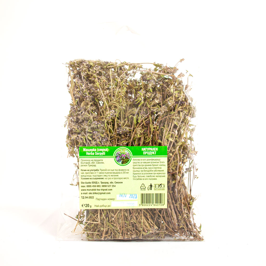 Въздействието на мащерката върху нервната система се изразява в подобряване на концентрацията, снемане на нервното напрежение и стреса. Способ использовать: Прилага се още под формата на чай, приготвен от 1 чаена лъжичка машерка и 250 мл вряща вода , подсладен с мед по желание. Съхранение: На сухо и прохладно място.