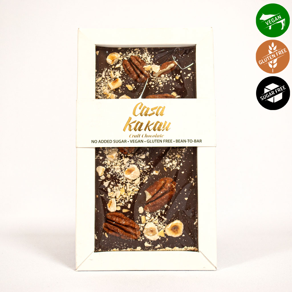 Този занаятчийски шоколад със 64% съдържание на какао, омагьосва с ядковия си вкус. Черен шоколад подсладен с еритритол, допълнен от хрупави лешници и пекан, поднесен като изящно изкушение. Шоколадите на Casa Kakau, създадени в Пловдив предлагат нов гурме вкус – занаятчийски шоколад. Занаятчийски означава, че не използват готова какаова маса, а работят с първичната материя – сурови какаови зърна, които сами изпичат, мелят на каменна мелница и превръщата в шоколад.